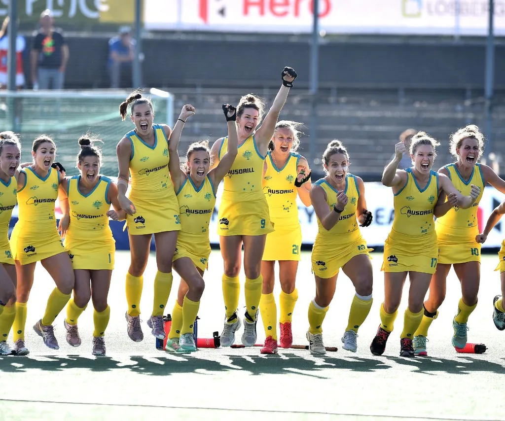 Australia celebrates after winning the shootout during the Women’s FIH Field Hockey Pro League semi-final match in 2019.