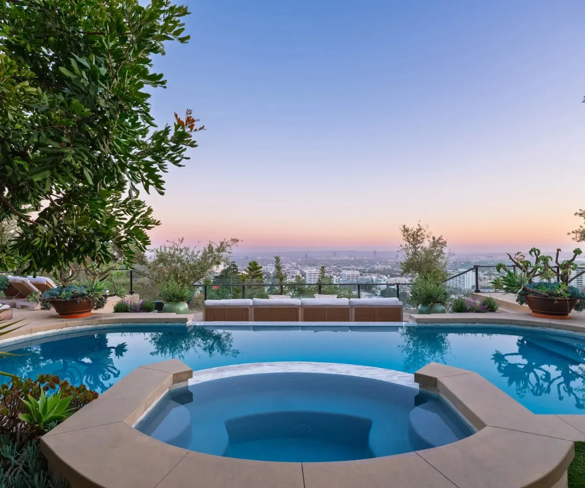 The outdoor space includes city and ocean views, a pool, a fire-pit and a vegetable garden.
