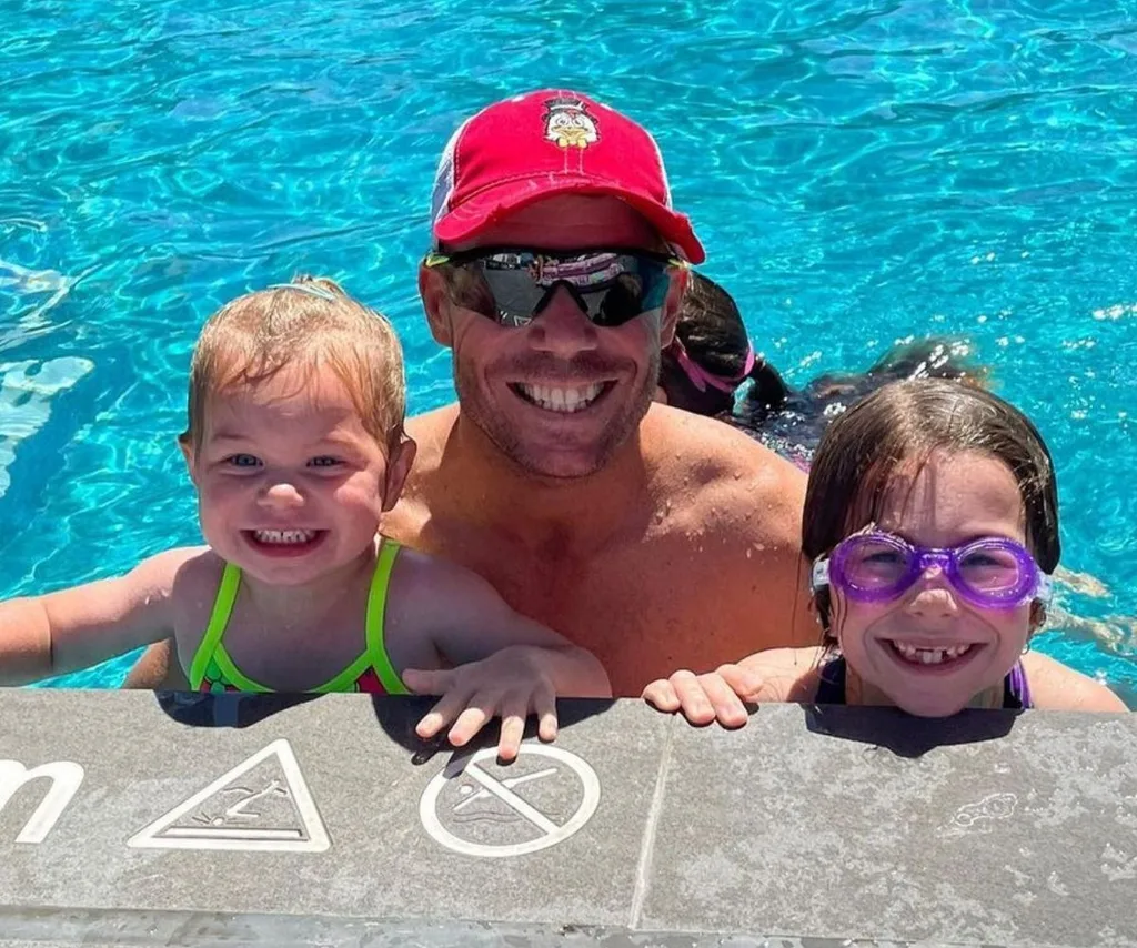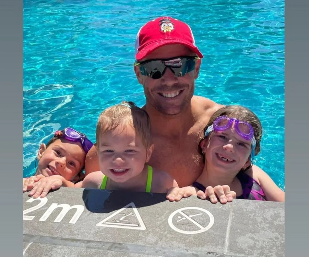 “So happy to be back with my girls, straight away it’s pool time ?? have missed you all soo much. #family #bestfriends @candywarner1,” he penned.