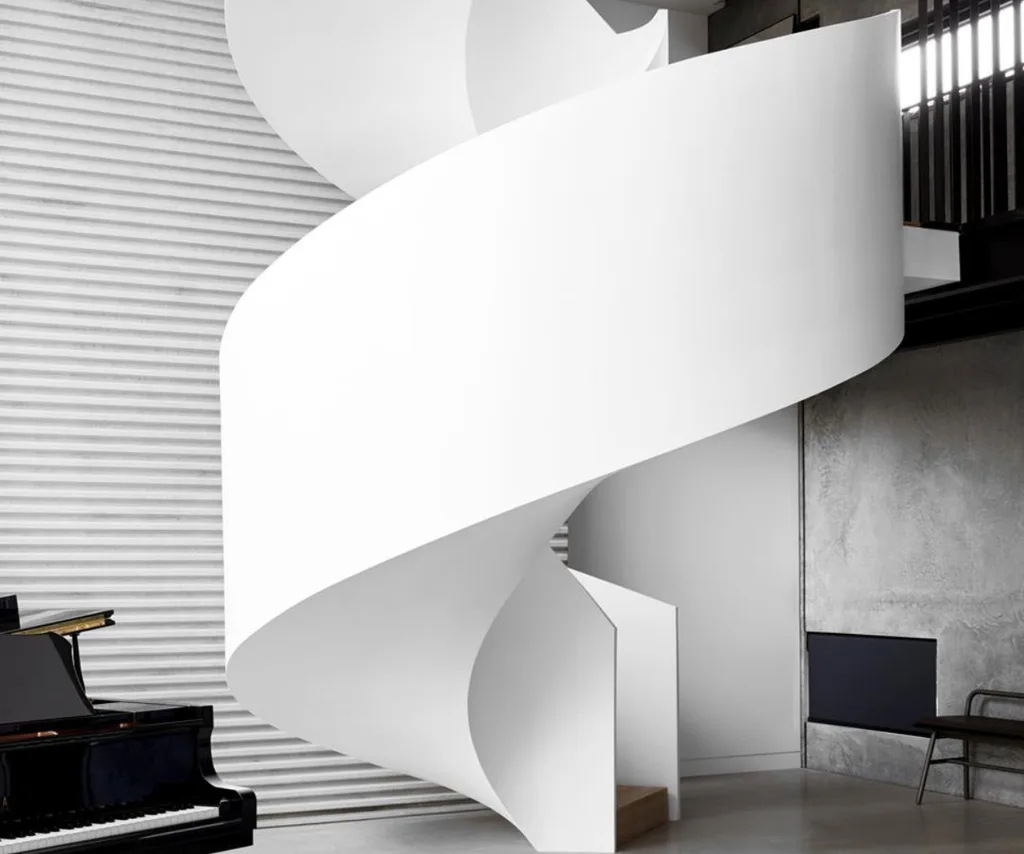 Lofty walls of horizontal ribbed concrete soften the void’s verticality, while the spiral stairs complement the curves of the grand piano.