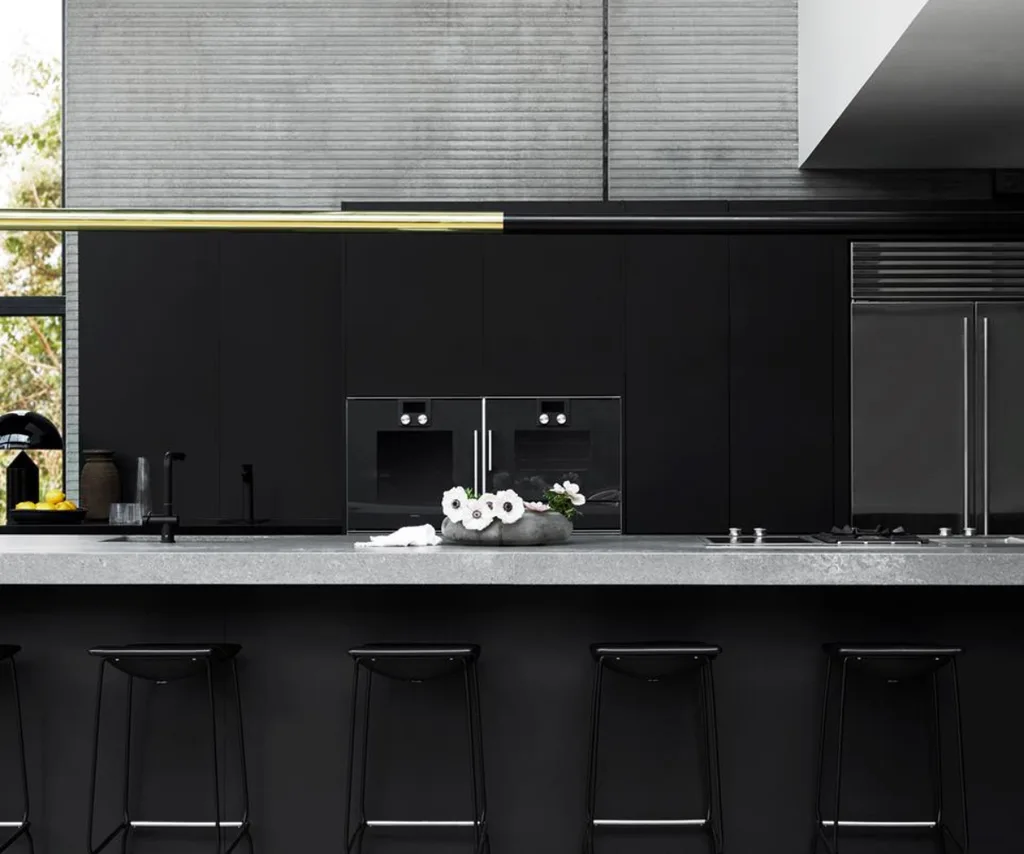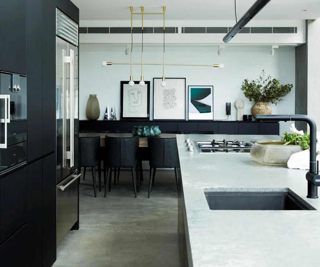Kitchen in Polytec Venette finish by Freedom Kitchens. Sub-Zero refiregerator and Gaggenau appliances, all from Winning Appliances. Viccarbe ‘Last Minute’ stools from Hub. Custom pendant light in solid brass. Active Plus pull out nozzle tap from Franke. Zip HydroTap in matt black. Caesarstone ‘Rugged Concrete’ engineered stone bench top.