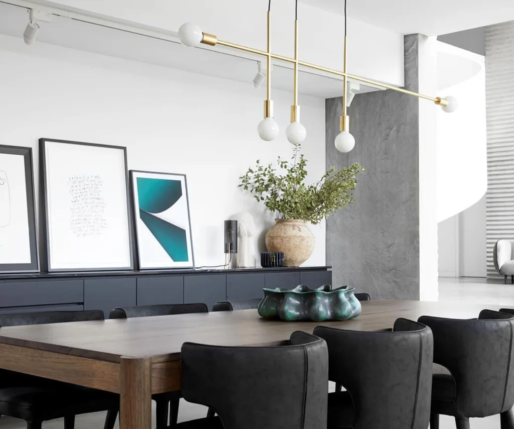 In the dining area, ‘Huxley’ table from Jardan with ‘Melrose’ chairs from Coco Republic. Step & Kick Series ‘Big Kick’ light in bronzed brass from Volker Haug Studio. Walls in Dulux ‘Lexicon’. Floors in polished concrete. Artworks, from left: Nicoline A. Milton Alirio print from Designstuff, print from Blacklist Store, and By Garmi Paper Shadows No.3 print from Designstuff.