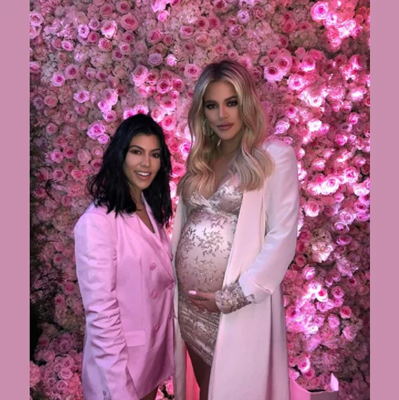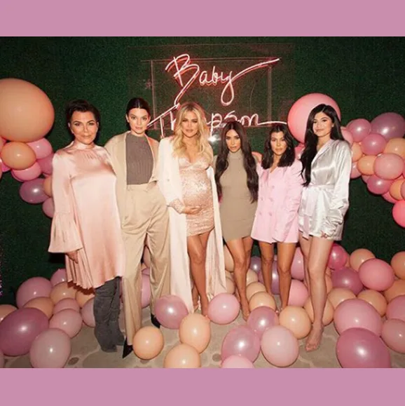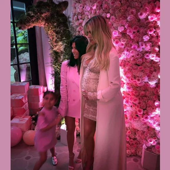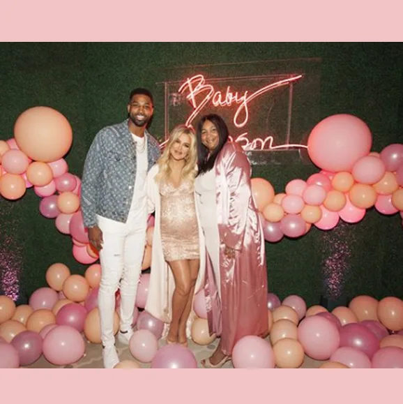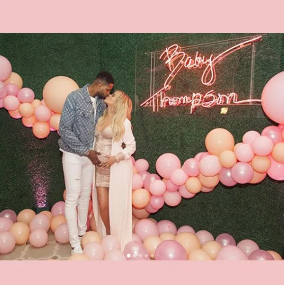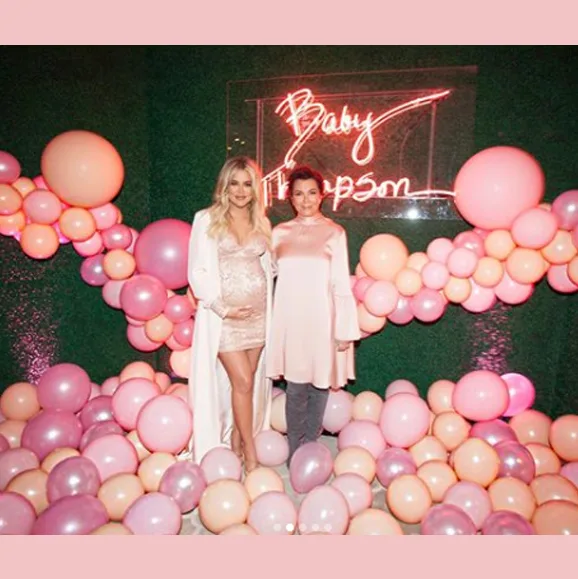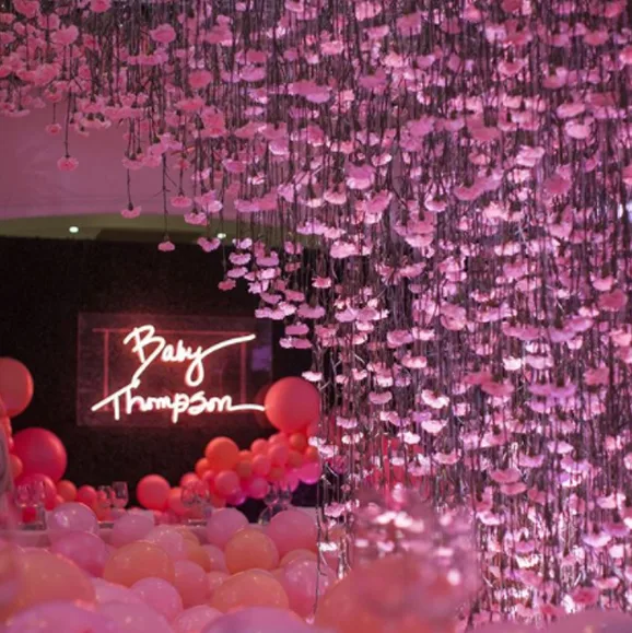 The event held at the Hotel Bel Air in LA was curated by a team of top event planners and stylists. Guests were treated to an extravagant scene as a waterfall of pink blooms cascaded from the ceiling, meeting a sea of pink and apricot hued balloons on the floor. A large circular table framed the spectacular floral display and a custom neon sign reading ‘Baby Thompson’ the surname of the baby’s dad, NBA star Tristan Thompson, lit-up the dining setting.