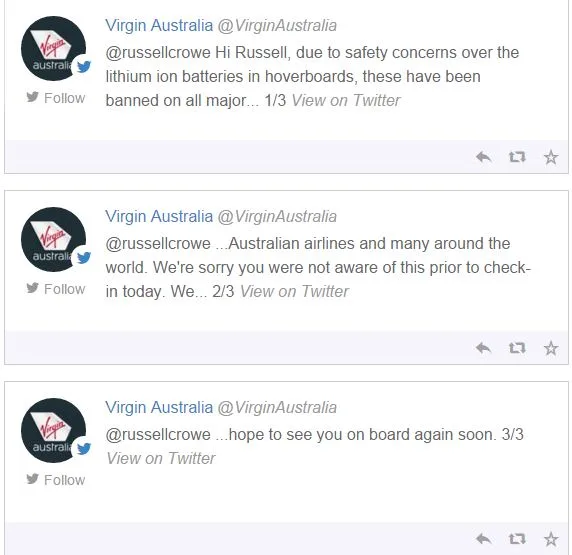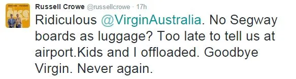 Actor Russell Crowe has hit out at Virgin Australia in a series of tweets, claiming he was barred from bringing his children’s hover boards onto a flight.