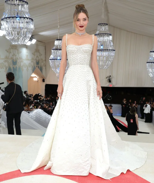At the 2023 Met Gala, Miranda wore a stunning pearl-embellished, off-white gown designed by Maria Grazia Chiuri for Christian Dior.