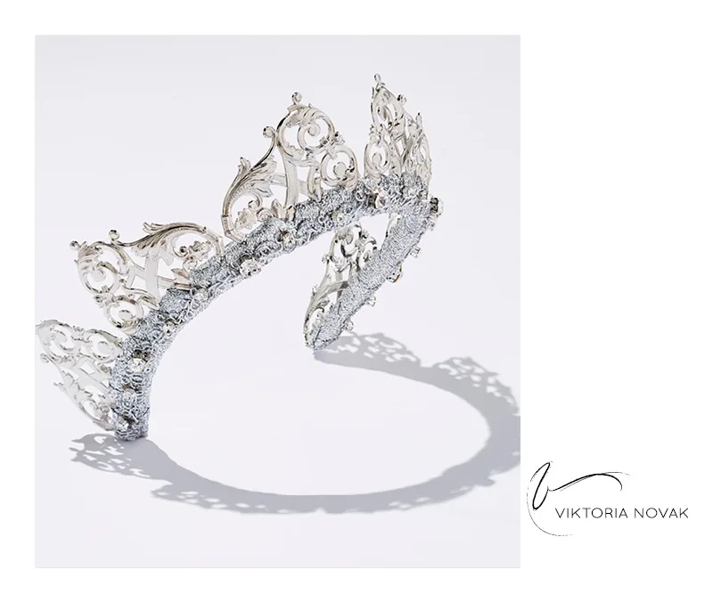 The crown jewel of the wedding was Meghan’s tiara, borrowed from the Queen’s very own jewellery vault. Inspired by the long line of exquisite royal tiaras, this gorgeous tiara is exclusively designed and handmade from rhodium plated filigree by Viktoria Novak. It features Swarovski crystals, vintage applique and luxe metallic silver braid.