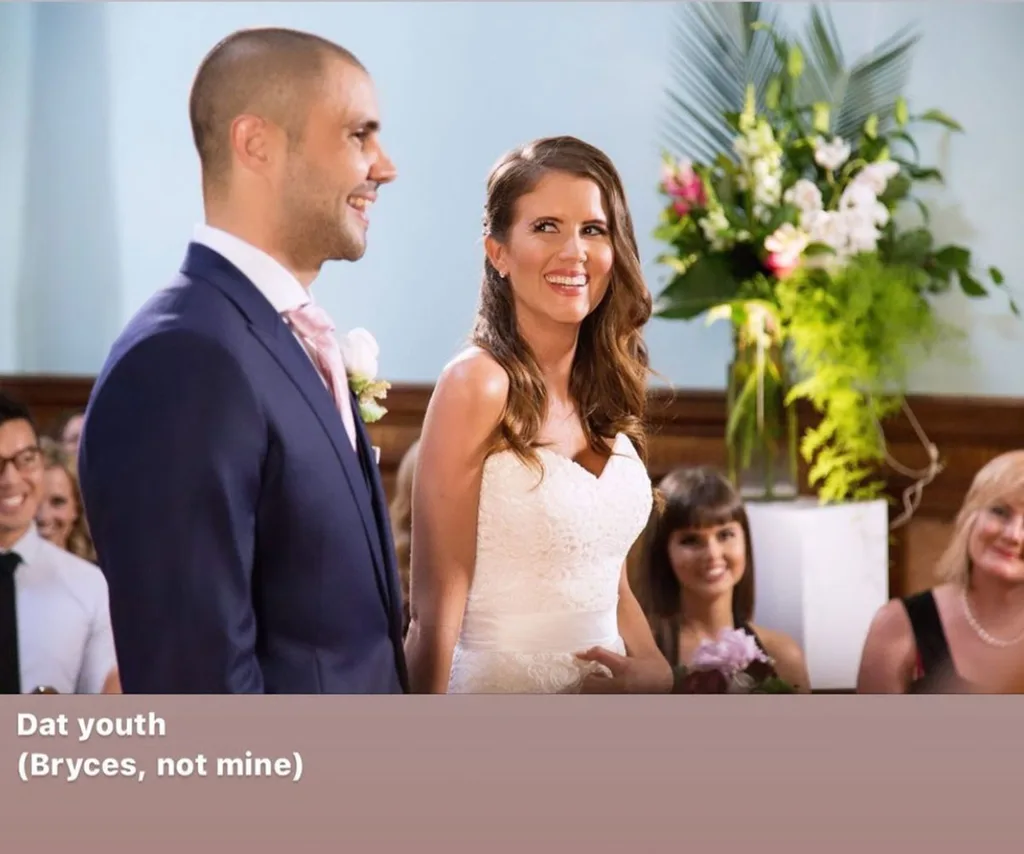 Erin poked fun of their apparent baby-faces on their 2015 wedding day.