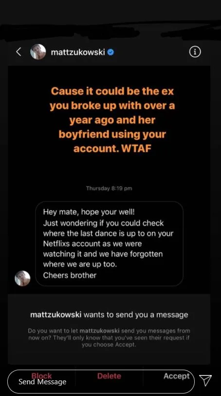 (Image: Instagram)A screenshot of the DM Keira’s new boyfriend Matt send Jarrod, asking about his Netflix account.