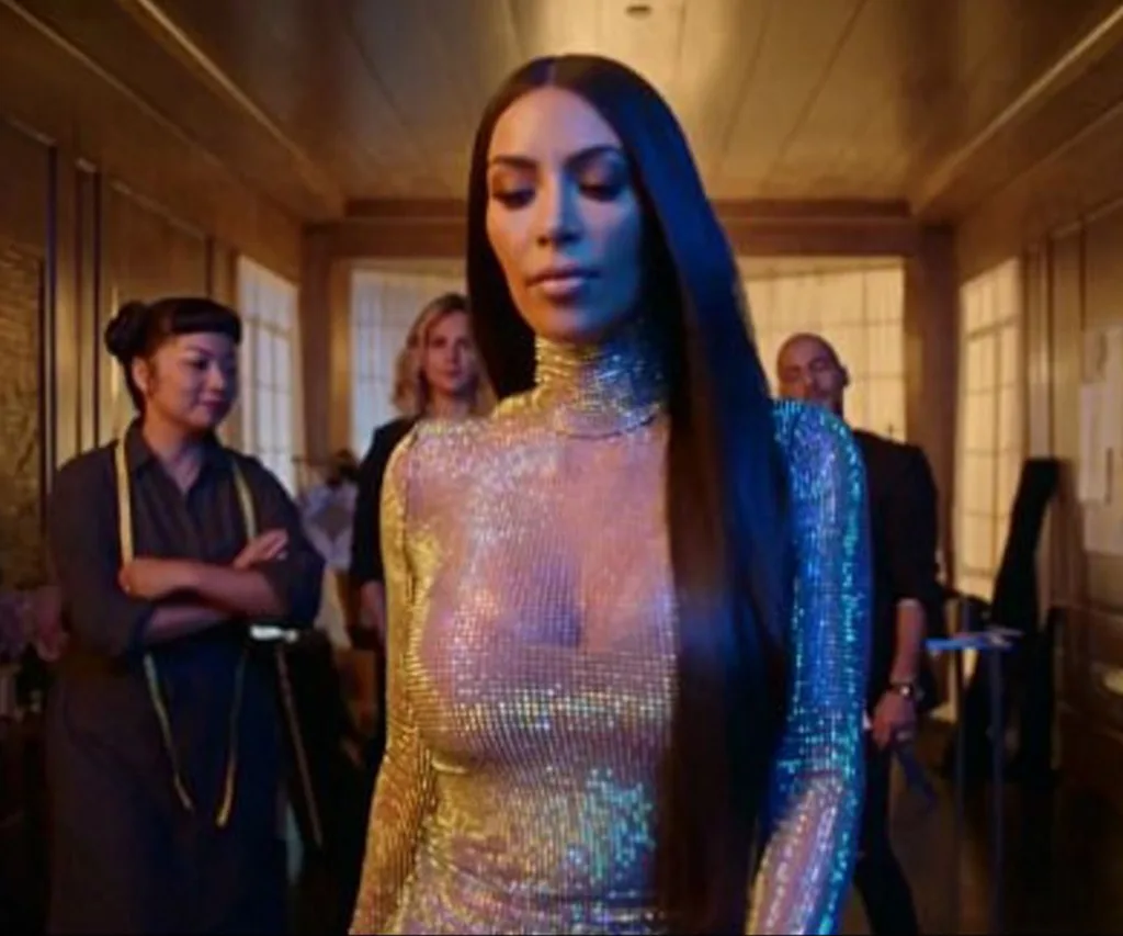 Meanwhile, Kim Kardashian is getting suited up in a body hugging sparkly jumpsuit before strutting in late and taking centre stage, just like in the original 2007 credits.