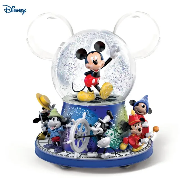 Perfect for those who desire all things Disney! This glass glitter globe with crystal-clear mouse ears captures Mickey Mouse through the years with eight fully sculpted figures in all. As if that’s not enough… the base also rotates to music!