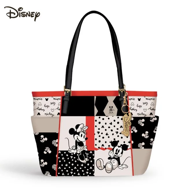 This exclusive and unique Disney tote bag features playful Mickey Mouse and Minnie Mouse art in a chic patchwork design and is crafted from pubbled faux leather. Perfect for any Disney princess!
