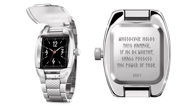 Inspired by the might and mystique of mythology, this men’s stainless steel flip-cover watch showcases the legendary hammer of Thor in dramatic style. This watch is engraved on the back of the casing with a quote and individual edition number.