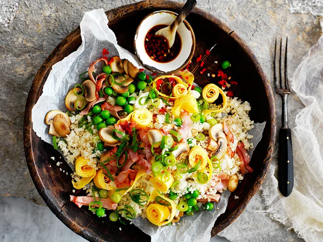 Cauliflower ‘fried rice’ with mushrooms and ham: For a low-calorie take on fried rice try this incredible cauliflower alternative loaded with vegies.