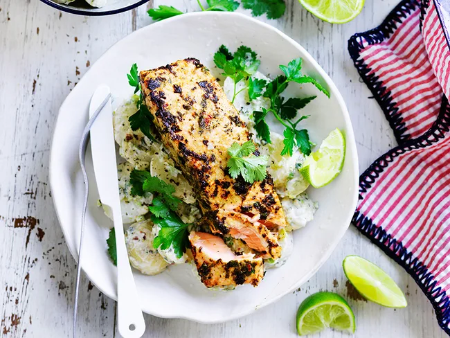 Jerk salmon with yoghurt potatoes: This tender, flaky jerk salmon with zingy flavoursome yoghurt potatoes really hits the spot! The perfect dish for dinner tonight: quick, easy and delish.