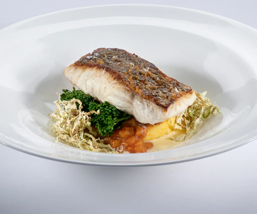 The main course is pan-seared mulloway served with baked polenta, broccolini and a beurre blanc.