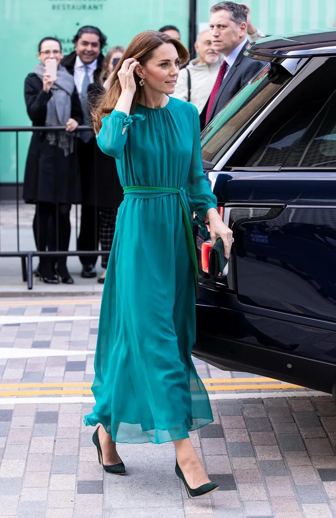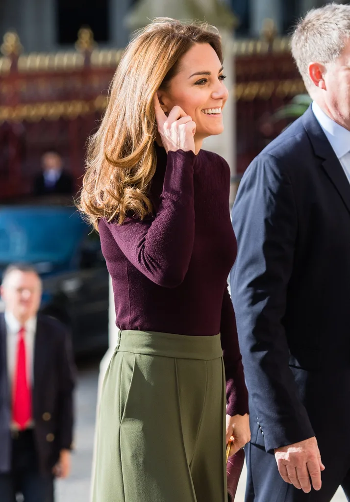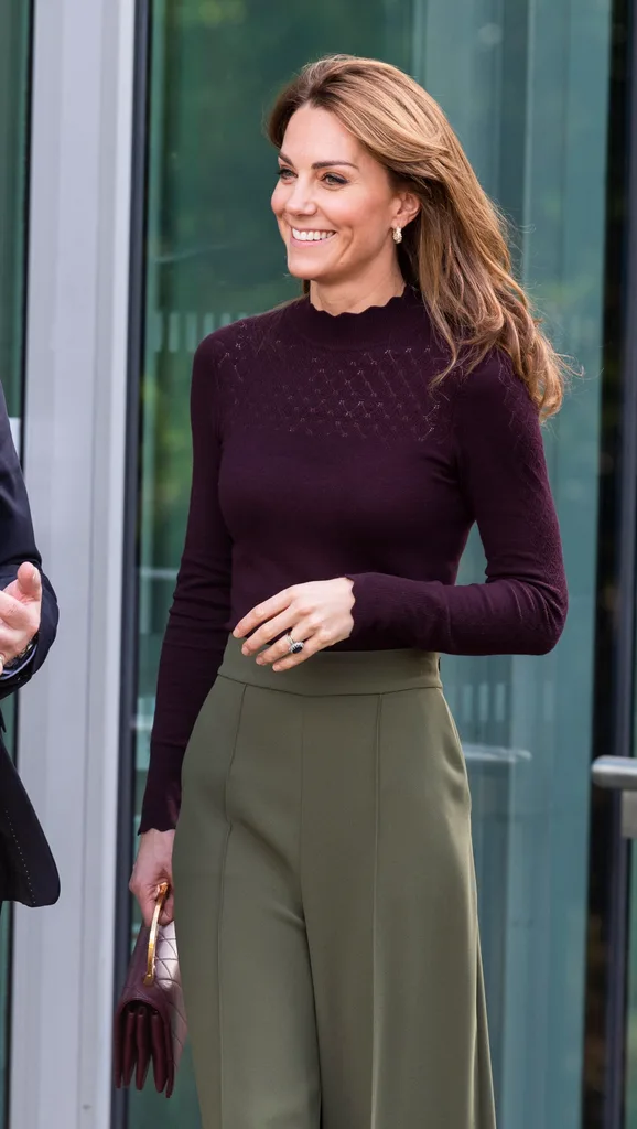 For the occasion, Kate wore an affordable Warehouse fine knit jumper, which featured a high neckline and subtle embroidery detailing. She paired the style with some chic wide-legged khaki pants by Jigsaw – the perfect choice for an autumn day in the British city.
