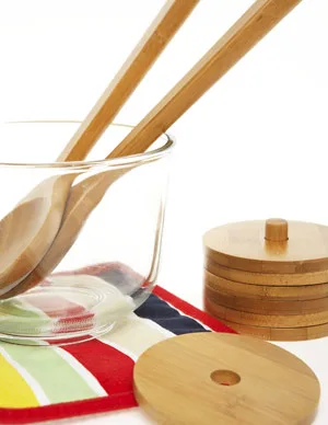 SunnyLIFE bamboo salad servers, $19.95, coasters, $24.95, and pot holder, $9.95.