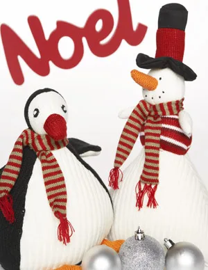 GUND hand-knitted penguin, $49.95, and snowman, $49.95, both through Jasnor. ‘Noel’ Christmas word from Splosh, $11.95.