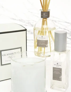 Glasshouse scented candle in Amalfi Coast, $34.95. Royal Doulton The Scent Of Christmas aroma reeds, $39.95, and room spray, $24.95, from David Jones.