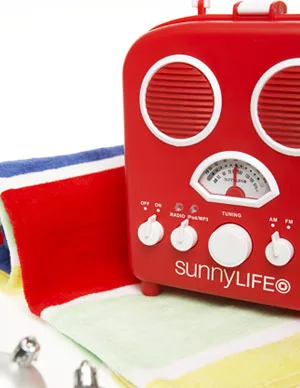 SunnyLIFE Beach Sounds radio, $39.95, and child’s hooded towel, $29.95.
