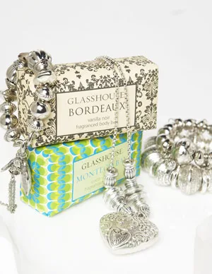 Glasshouse Bordeaux Vanilla Noir body bar and Montego Bay Coconut Lime body bar, $12.95 each. Sussan necklace, $29.95, and bracelets, $24.95 each (small), and $34.95 (large).