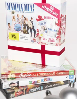 Mamma Mia! DVD gift set, $49.95, Barbie In A Christmas Carol DVD, $24.95, Baby Mama DVD, $39.95, and Hellboy II: The Golden Army DVD, $39.95, all available from leading DVD retailers.