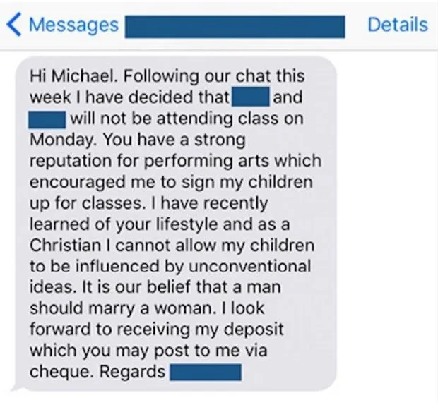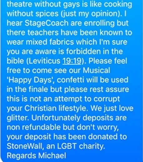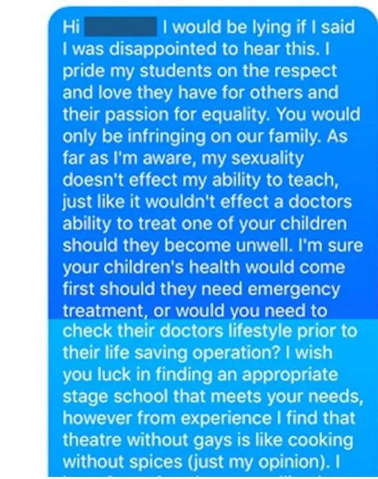 Michael Neri, a 26-year-old theatre producer and drama teacher in the U.K., responded to a mother’s wish to pull her children from his drama class because of his sexuality, in a text message that has now gone viral.
