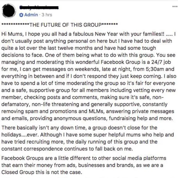 “Managing and monitoring this wonderful Facebook page is a 24/7 job for me,” she wrote, “I get messages on weekends, late at night, from 5:30am and everything in between and if I don’t respond they just keep coming.”