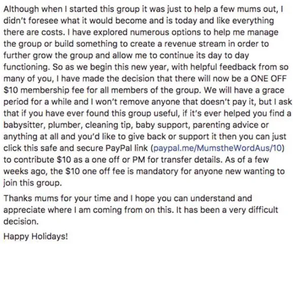 In a Facebook post titled ‘The future of this group’ the group’s administrator outlined the ‘difficult decision’ to enforce a $10 fee. She claimed the fee will cover the costs of running and monitoring the popular page.