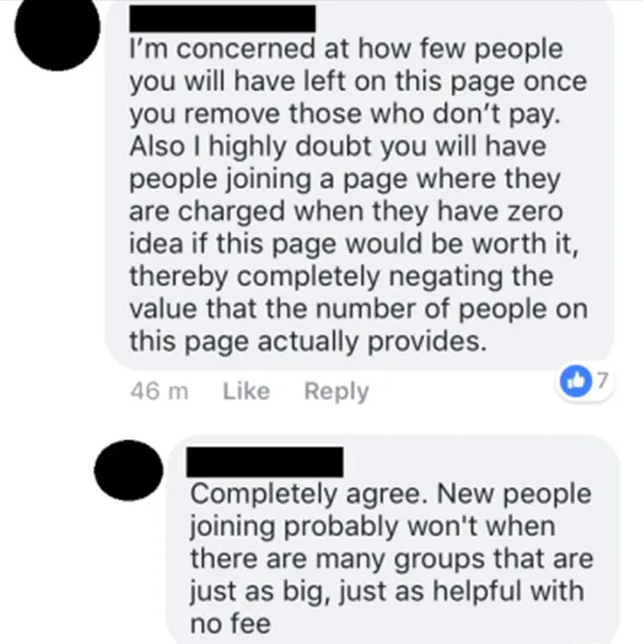 “I’m concerned at how few people you will have left of this page once you remove those who don’t pay,” wrote member adding: “Also, I highly doubt you will have people joining a page where they are charged when they have zero idea if this page would be worth it, thereby completely negating the value that a number of people on this page actually provides.”