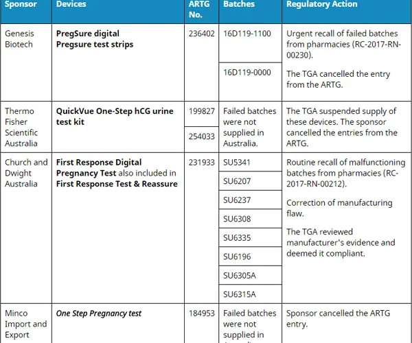 The TGA’s investigation came after family planning clinic reported three false negative results by the of the One Step HCG urine pregnancy test. The watchdog tested the specific model, found it to be inaccurate and it was recalled.
