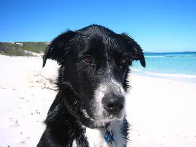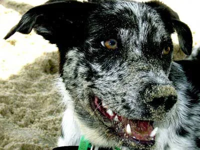 One of my Koolies, Cookie at Seacliff beach, SA. After too much ball-chasing she ended up with a mouthful of sand! Monique Meeuwissen.
