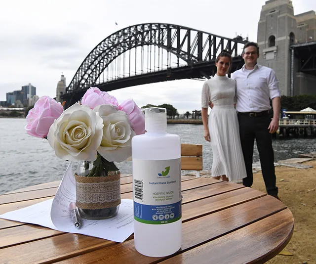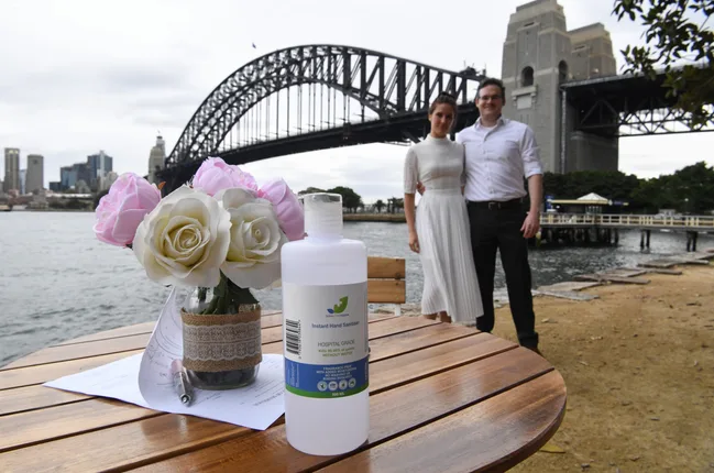 Sydney couple Lara Laas and Daniel Clark tied the knot with the most precious wedding gift – hand sanitiser. They’re just missing the toilet roll!