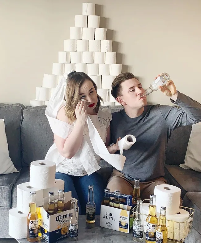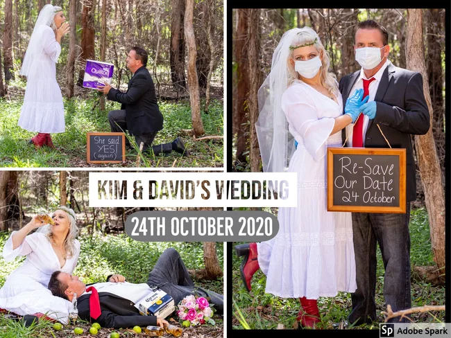 Still not sure about going ahead with your wedding? Do what Kim Henrickson and her partner David Woolston did and have a corona-themed postponement photo shoot!