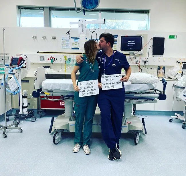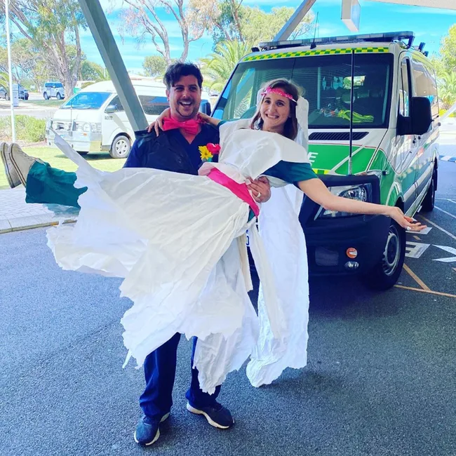 Emergency doctors Greta Geninson and Max Allin were meant to marry in April, but spent the day working at Geraldton Hospital.