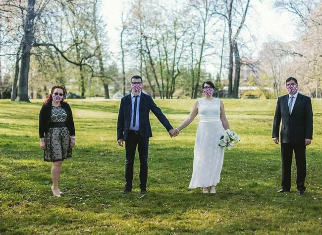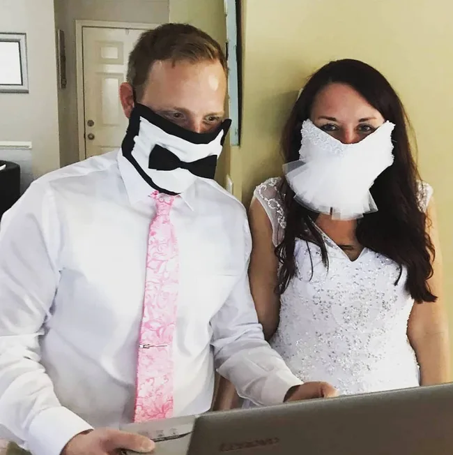 They may not be fashionable, but some decorated face masks will make the wedding photos memorable.