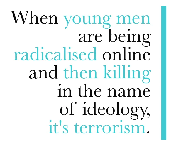 We need to start recognising misogyny for what it is—a destructive ideology that’s killing women. When young men are being radicalised online, by groups like the incels, and then using violence as a means to create terror amongst masses of people in the name of this ideology, it’s terrorism.
