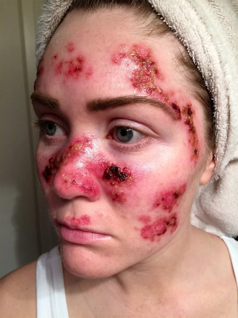 Captioning it “If anyone needs a little motivation to not lay in the tanning bed and sun here you go! This is what skin cancer treatment can look like”, the picture depicts Tawny’s face covered in scabs and lesions after having a skin cancer treatment done.