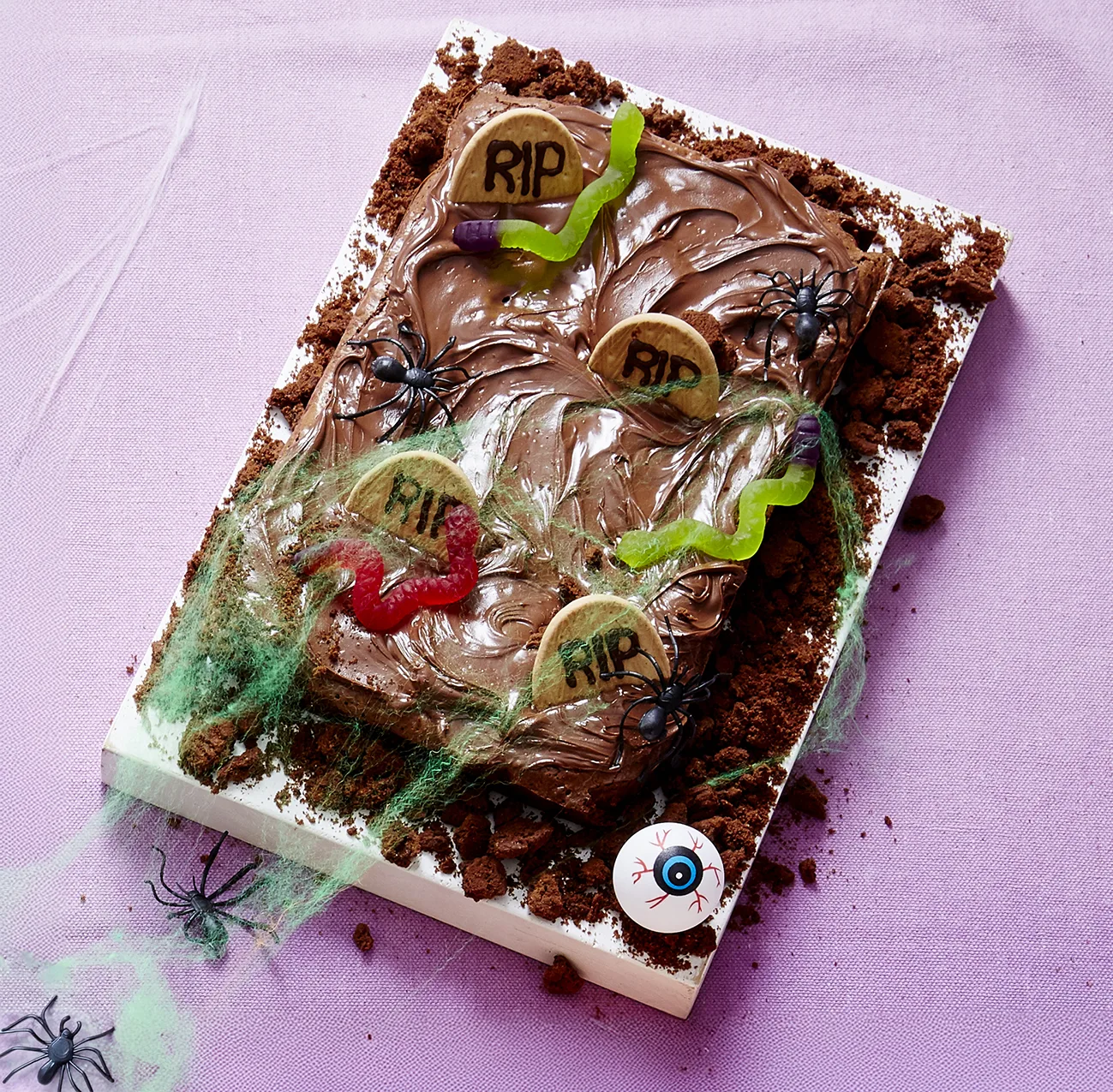 Spread top with 1 cup whisked Nutella. Crush 100g chocolate biscuits and sprinkle around base. Halve 6 arrowroot biscuits and pipe RIP with melted chocolate. Set, then press into Nutella as headstones. Decorate with jelly snakes and extra toys.