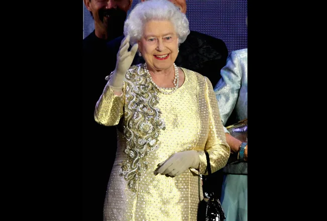 Queen Elizabeth II, who arrived mid-way through the concert, waves to the crowd.