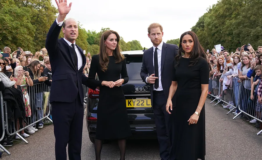 Kate, William, Harry and Meghan greeted onlookers and took flowers for the late queen.