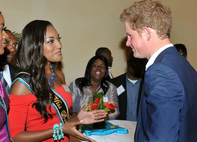 Harry blushes as he chats to the beautiful Miss Bahamas Anastagia Pierre.