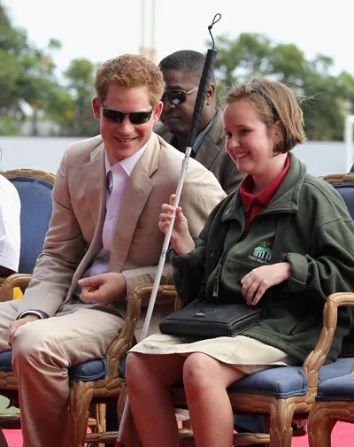 The prince befriends a blind schoolgirl at a youth rally in Nassau.