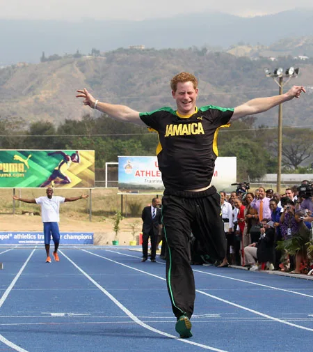 Harry ‘beats’ the world’s fastest man Usain Bolt in a running race in Jamaica.