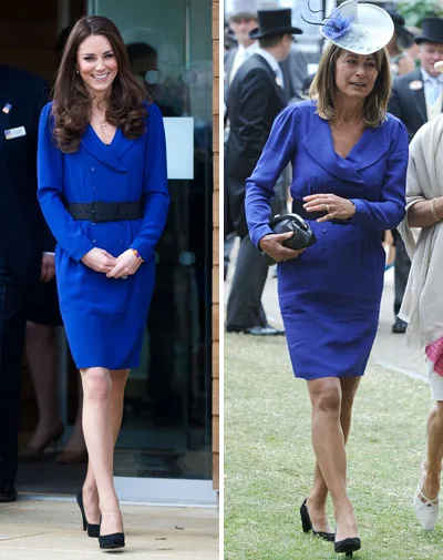 Kate in Suffolk yesterday, and Carole Middleton at Ascot in 2010.