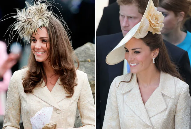 Kate at Laura Parker Bowles’ wedding in 2006 and at Zara Phillips’ wedding in July 2011.
