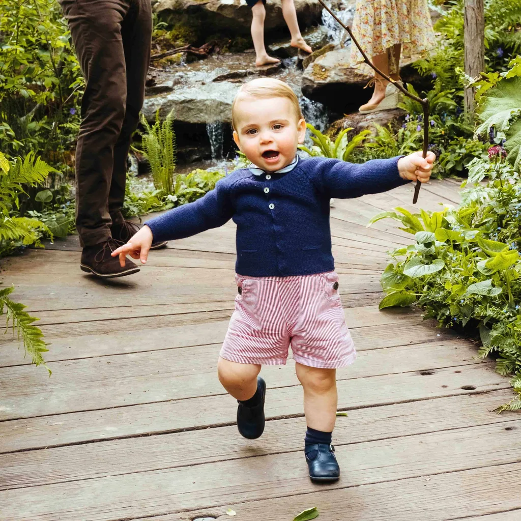 In a series of never-before-seen snaps of the family released by the Cambridges, Louis was seen taking tentative steps towards the camera while being egged on by his dad – too cute!