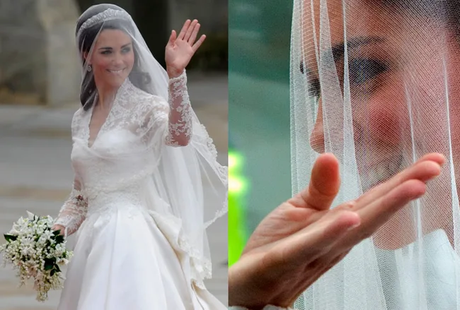 Kate’s hair was worn down, softly pushed away from her face with drop diamond earrings. A tiara with lace veil attached completed her elegant princess bride look.
