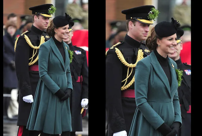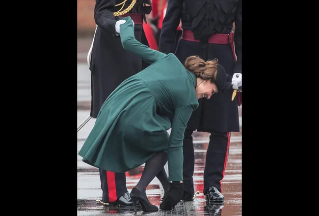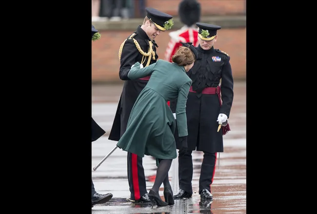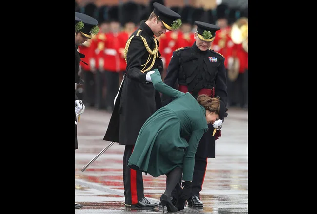 The Duchess of Cambridge was as graceful as ever after suffering a slight wardrobe malfunction during a visit to Mons Barracks in Aldershot, Hampshire, for a St Patrick’s Day parade.