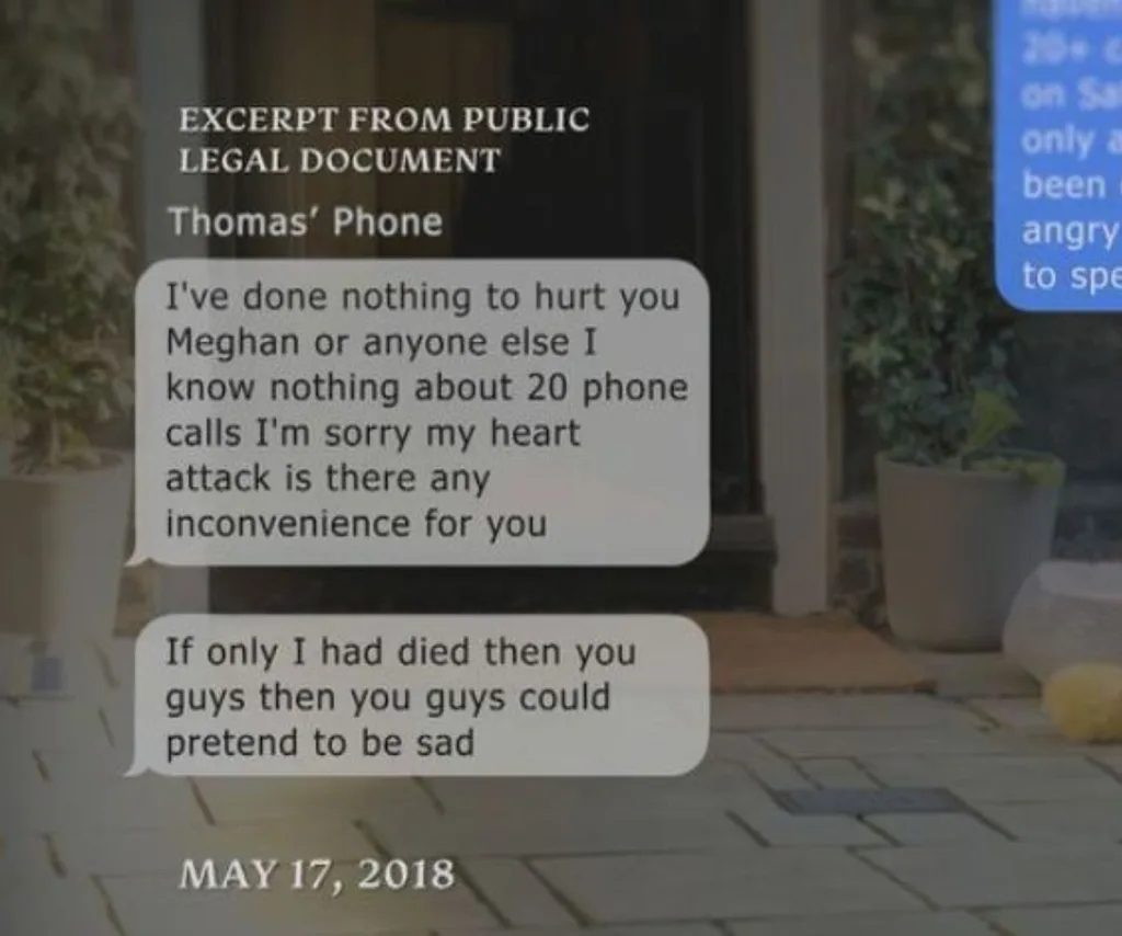 The couple eventually did hear back from ”Thomas” who wrote, ”I’ve done nothing to hurt you Meghan or anyone else I know nothing about the 20 phone calls. I’m sorry my heart attack is an inconvenience for you.”